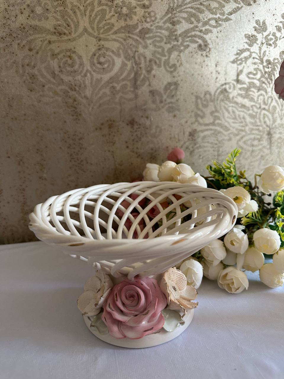 Фруктовниця "Міранда" з елементами ручної роботи- справжній витвір мистецтва, створений з душею та натхненням. Ця фруктовниця стане вишуканою прикрасою вашого столу, надаючи йому ніжності та витонченості