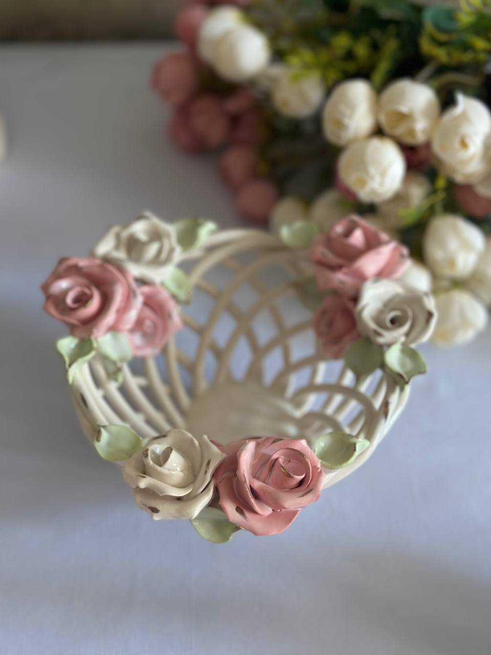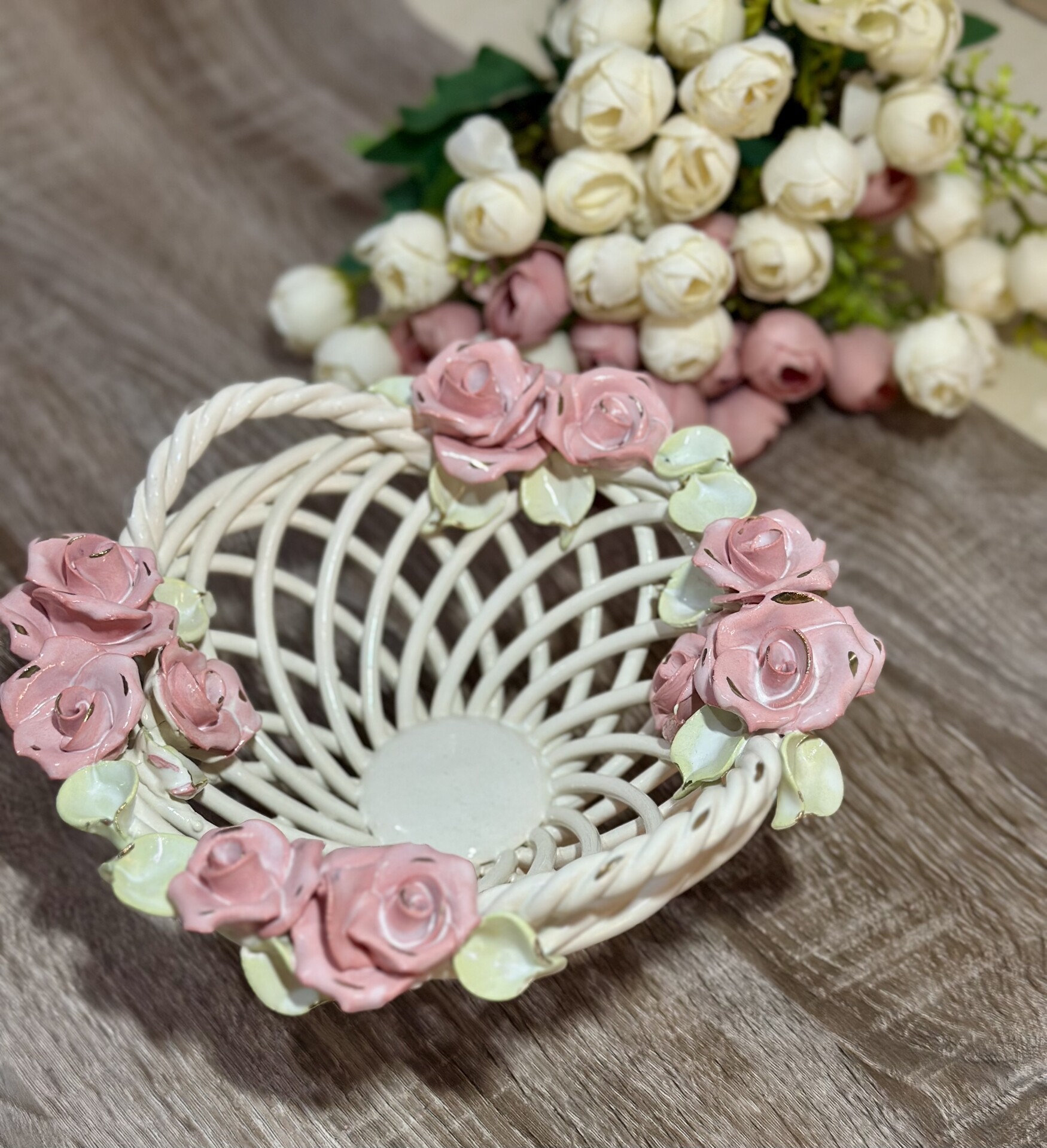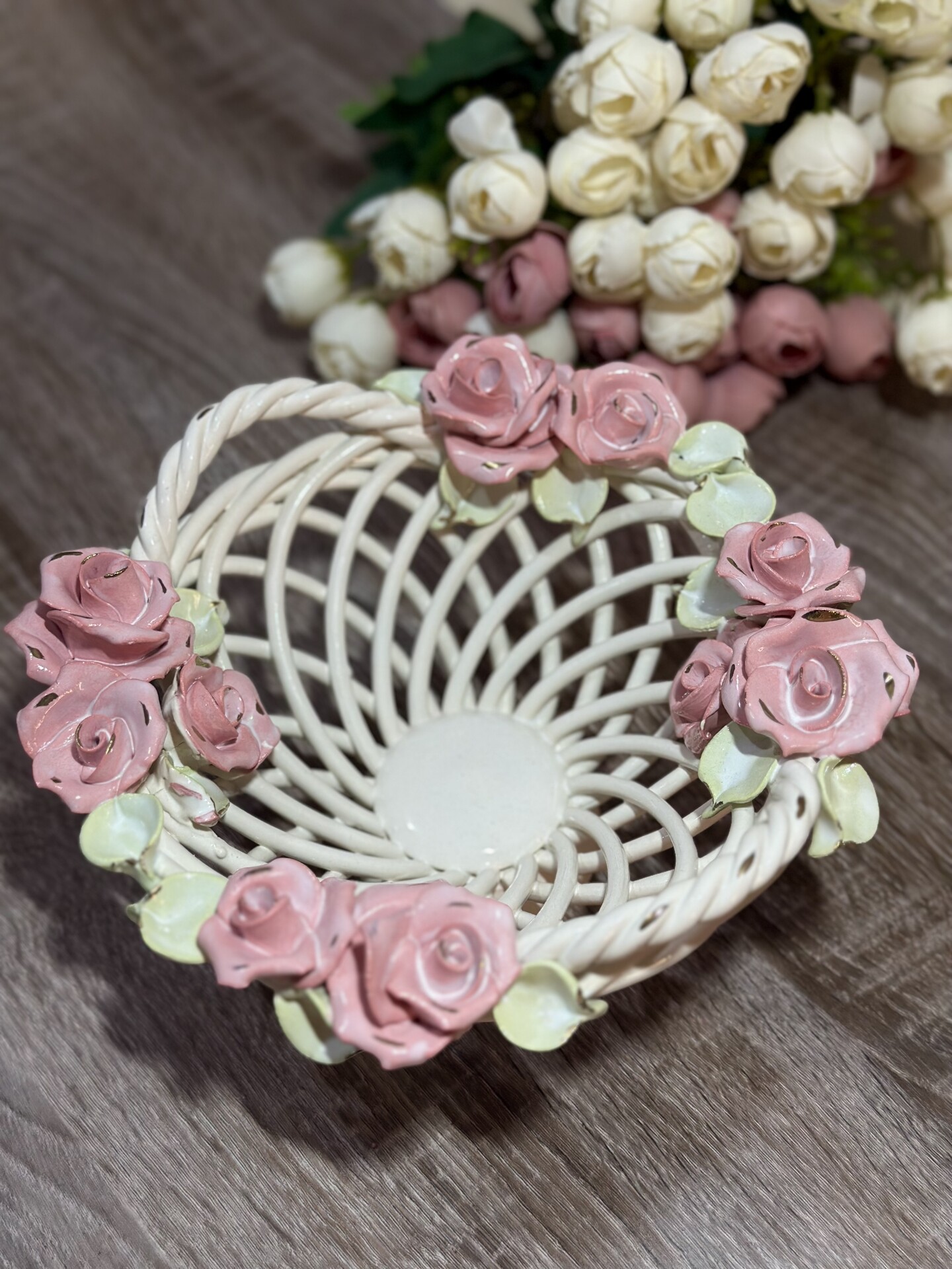 Кошик-цукерниця "Казка" з елементами ручної роботи- справжній витвір мистецтва, створений з душею та натхненням. Ця цукерниця стане вишуканою прикрасою вашого столу, надаючи йому ніжності та витонченості.
